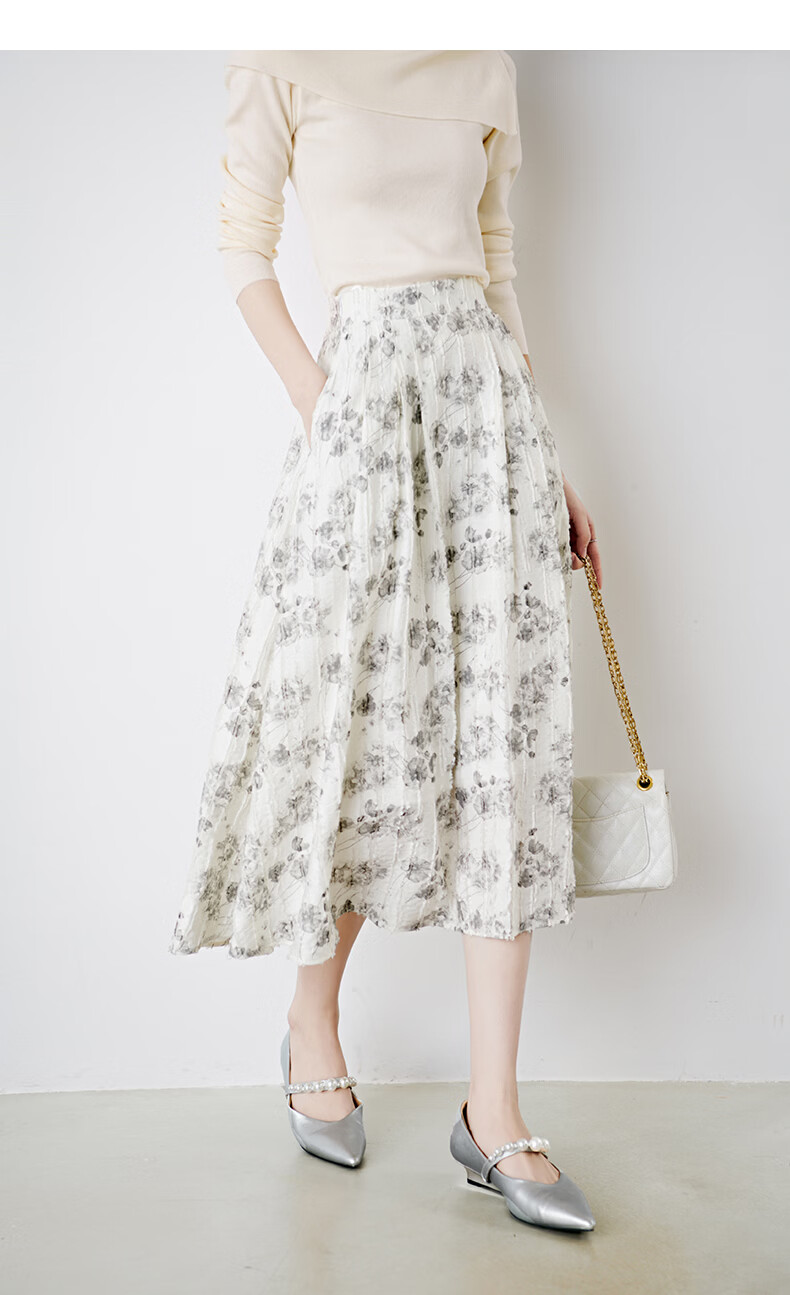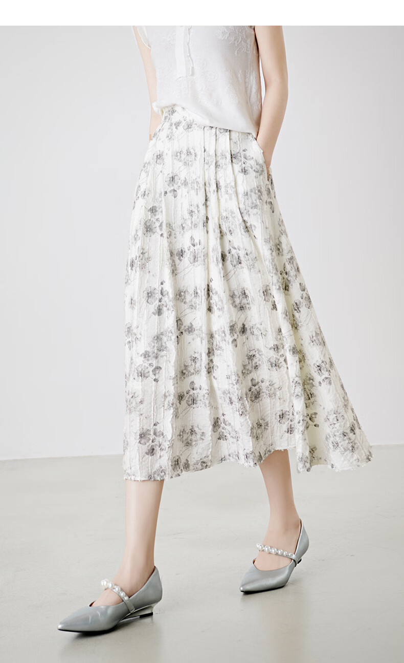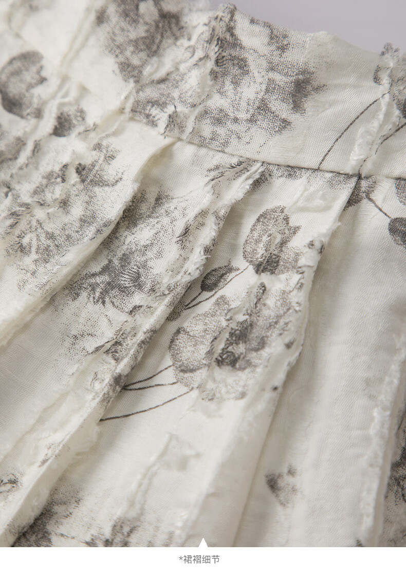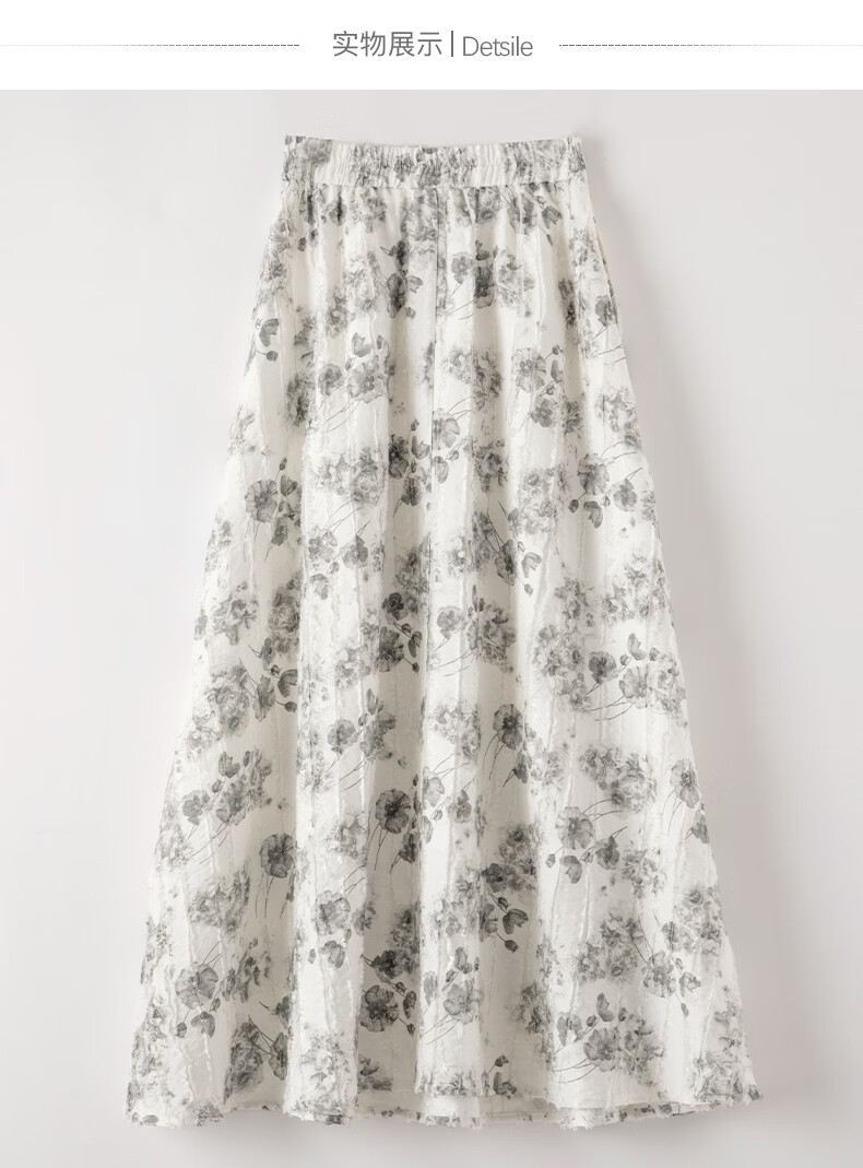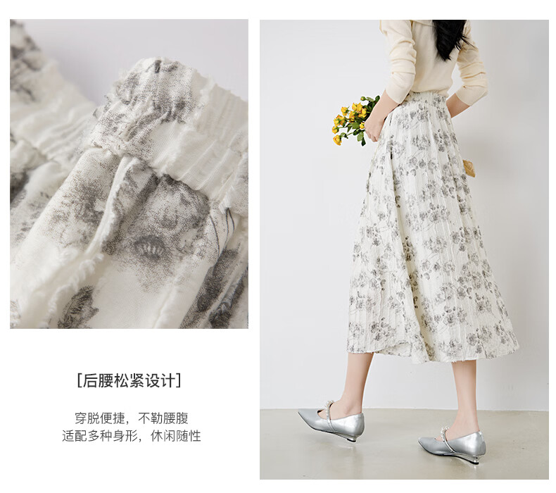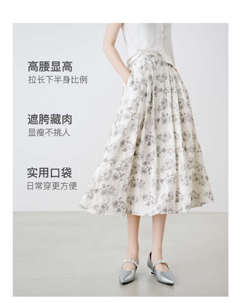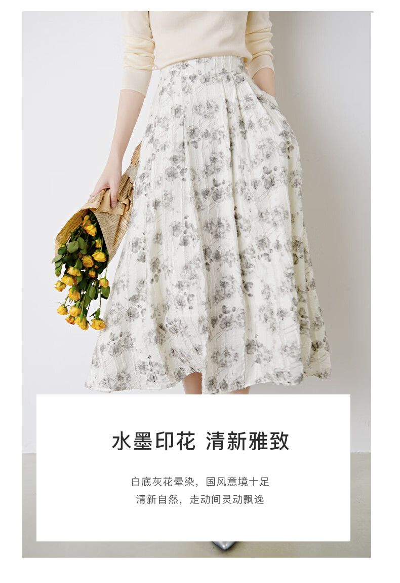 晚白2026年春款时尚优雅水墨印花半裙后松紧舒适显瘦大摆带口袋半身裙 米白色 M